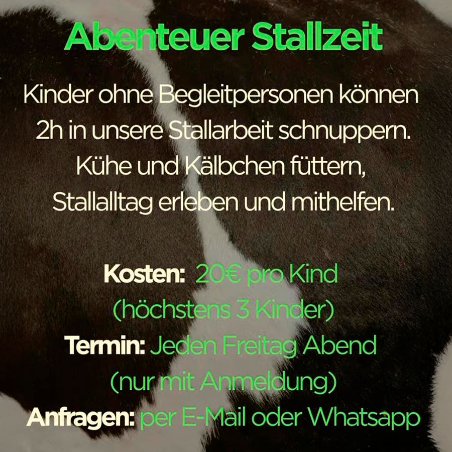Kinder ohne Begleitperson können 2 Stunden in unsere Stallarbeit schnuppern. Kühe und Kälbchen füttern, Stallalltag erleben und mithelfen.